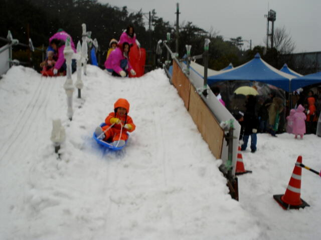屋外:特産品テント・・・ 岡山県蒜山と島根県江府町から当日の雪を手配いたしました。 |