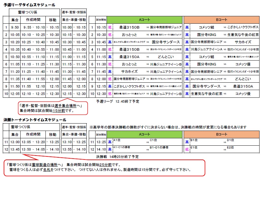 国分寺町冬のまつり雪合戦大会参加チームの皆様へ 大会当日のご案内 1.参加チームの受付は午前9時からです。選手などに変更がある場合は必ず受付時に申し出て下さい。 2.開会式は9時30分です。参加チーム全選手が9時25分までにステージ前へチームのプラカードを持って、1列に並んで下さい。 3.受付時に各チームにゼッケン1セットをお渡しします。そのチームの全試合が終了するまで、同じゼッケンをご使用ください。 4.選手・監督・お世話係は試合開始15分前までに選手集合場所に集合して下さい。お世話係はゼッケン・ヘルメットの着脱の補助をお願いします。ヘルメットは深くかぶり、あごのベルトをしっかり締めて下さい。ゆるいと怪我の原因になります。ヘルメットは必要に応じてアルコール消毒をしてください。 5.雪球つくり係は、試合に使用する雪球を作ります。試合開始25分前までに、雪球製造場所に集合して下さい。必ずネームプレートの着用をお願いします。(各チーム6枚配布)。雪球つくりも競技の一部ですので、必ずスタッフの指示に従って下さい。 6.貴重品の管理については、各チームでお願いします。荷物置き場はAコート観客席の後ろ側にありますので、ご利用下さい。 7.洋服等が濡れたときのための着替え、靴、手袋等をご準備下さい。 8.チームの選手の体調管理を行い、決して無理をさせないようにお願いします。救護は本部テントに看護師を常駐させていますが、応急処置のみとなります。 状況に応じて新型コロナウイルス感染症やインフルエンザの感染拡大防止対策にご協力下さい。 9.本大会の参加者(選手・監督・世話係・雪球つくり係)は1日傷害保険(入院2,000円、通院1,000円)に加入しています。 10.本大会はJT『ひろえば街が好きになる運動』に参加しています。 自分たちのゴミ類はお持ち帰りいただきますようご協力ください。 なお、会場内は禁煙ですので、指定の場所での喫煙をお願いします。 注意事項 (注意事項の印刷はこちらのPDFからどうぞ) |